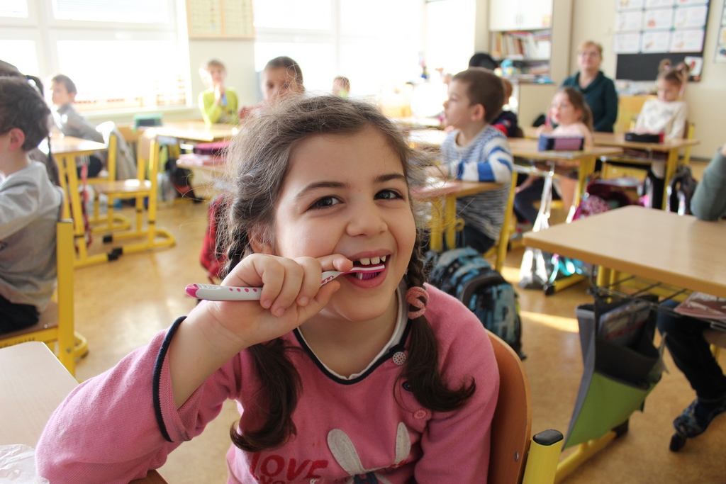 Deti trávia v škole veľkú časť dňa a učitelia sú pre ne prirodzenou autoritou. Ak sa správna starostlivosť o zuby stane súčasťou bežného vyučovania, deti ju vnímajú ako normu, nie ako povinnosť. Pravidelná edukácia pomáha: